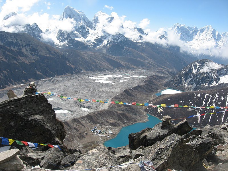 Главное, что впечатляет с первого взгляда - это внешний вид ледника Нгозумба. Его поверхность почти полностью покрыта мощным слоем камней, щебня и валунов. Такой тип называют ледниками, покрытыми обломками. Сторона, обращённая к наблюдателю, больше напоминает хаотичную, гигантскую строительную площадку или каменную реку, нежели традиционный ледяной покров.