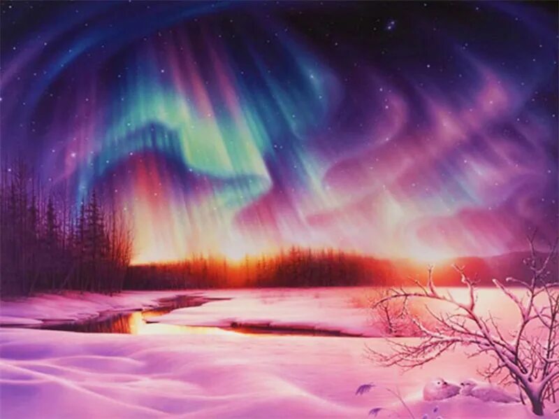 Солнечные искры догнали её высоко в небе и окружили. От её ледяного платья они отразились и рассыпались на миллионы мерцающих частиц зелёного, фиолетового и розового цвета - так впервые вспыхнуло северное сияние.