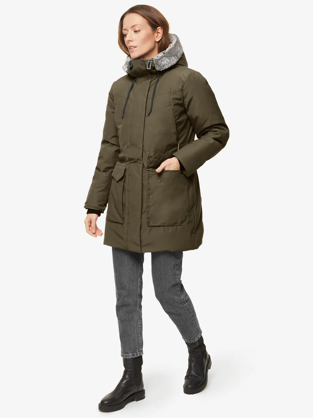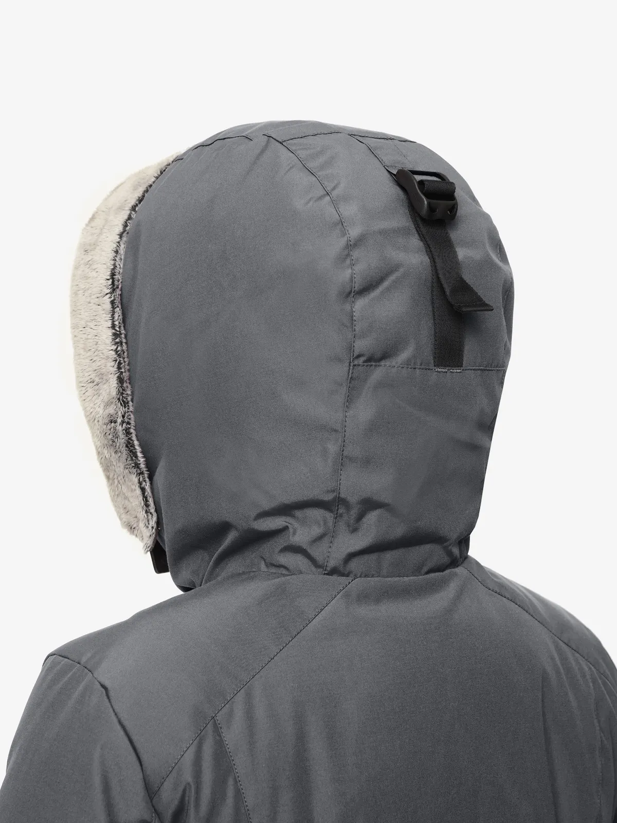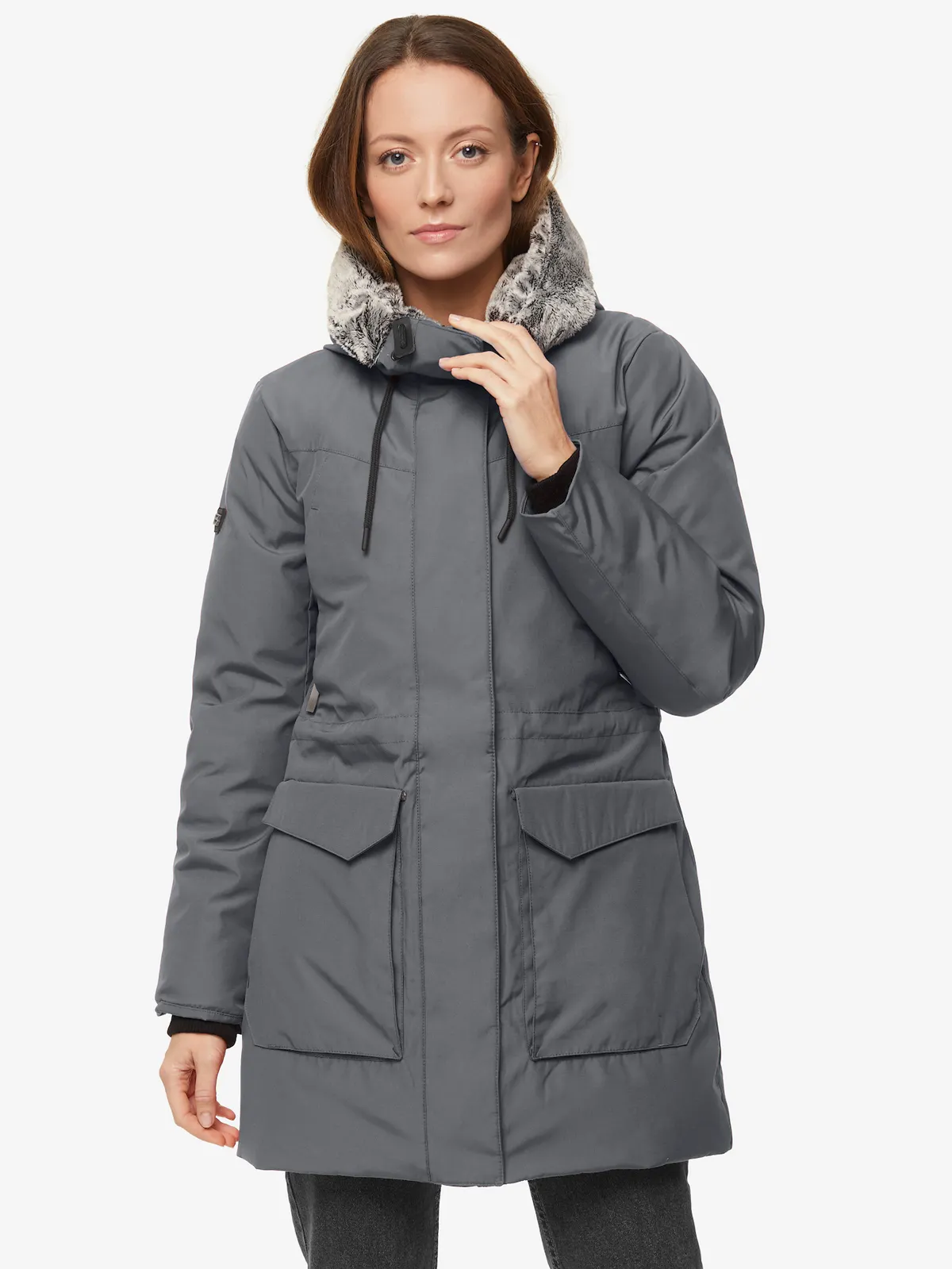 - теплый капюшон с меховым отворотом регулируется по объему